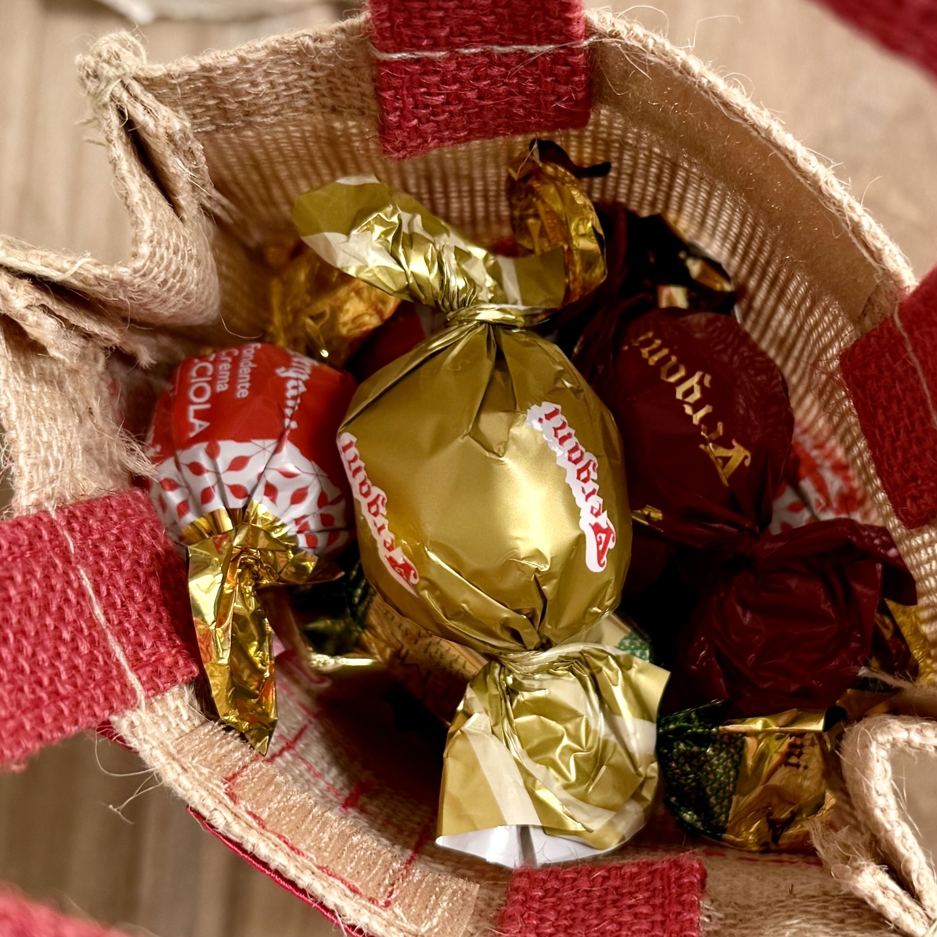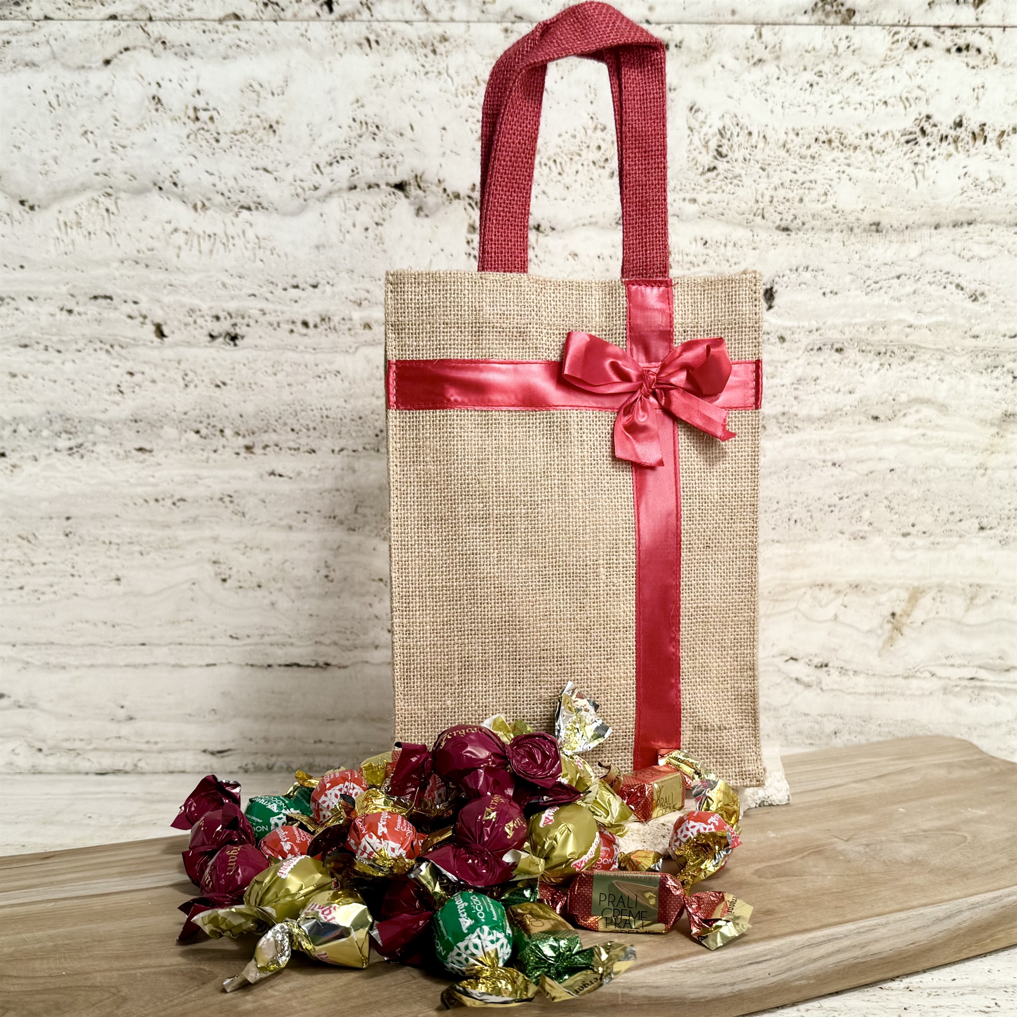 Blandade godsaker i Julväska med rosett som innehåller 7 varianter inpackade praliner med hasselnöt, jordgubbskräm, toffee, karamell, kokoskräm, apelsinkräm, flytande karamell med nötter. Juteväskan är ett fullt biologiskt nedbrytbart material, en vegetabilisk fiber och 100 % komposterbar. En hållbar, slitstark och miljövänlig produkt som passar perfekt in i vår ständiga jakt på att våra förpackningar ska vara Reduce & Reuse vänliga.