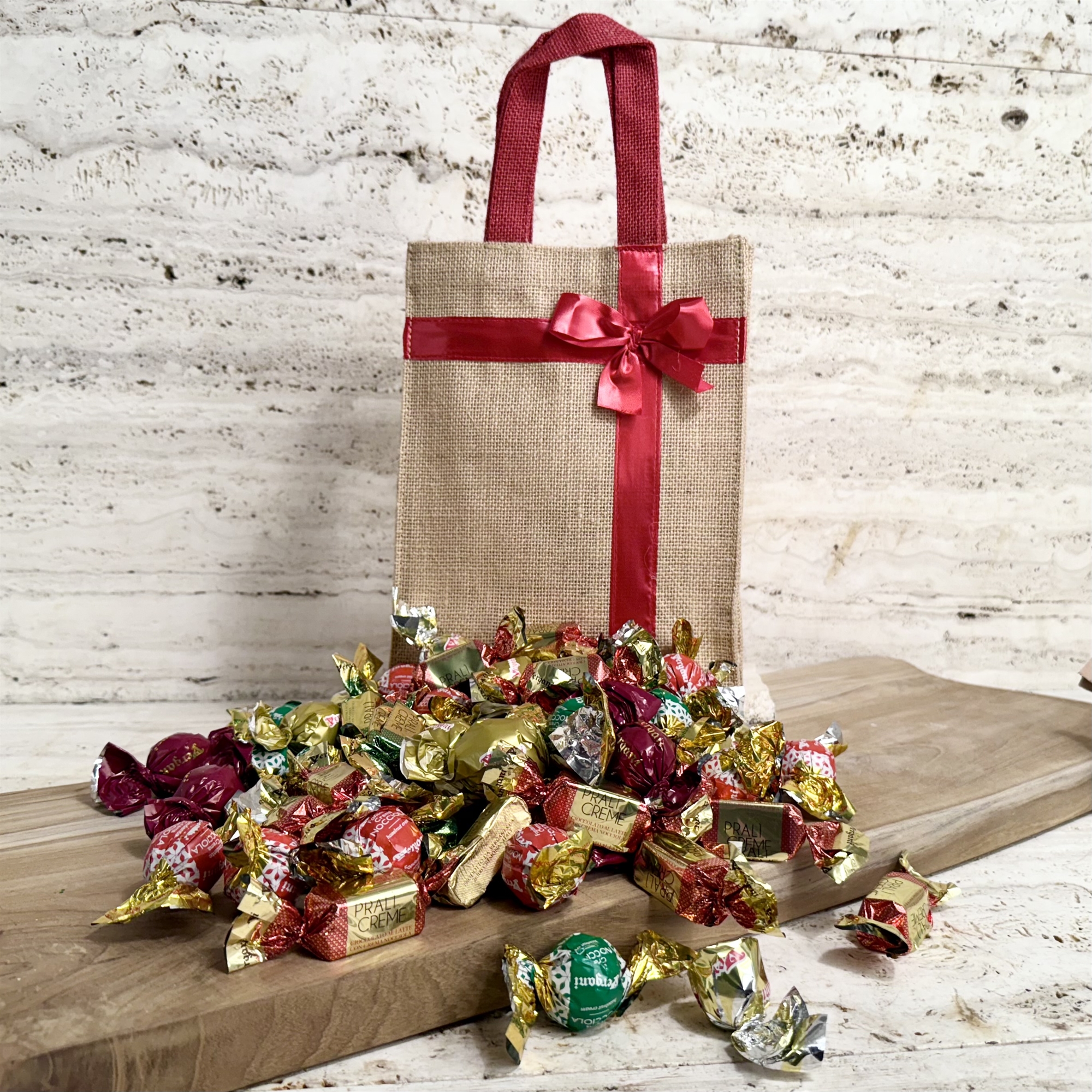 Blandade godsaker i jutesäck med rosett som innehåller 7 varianter inpackade praliner med hasselnöt, jordgubbscreme, toffee, karamell, kokoscreme, apelsincreme, flytande karamell med nötter. Jutesäcken är ett fullt biologiskt nedbrytbart material, en vegetabilisk fiber och 100 % komposterbar. En hållbar, slitstark och miljövänlig produkt som passar perfekt in i vår eviga jakt på att våra förpackningar ska vara Reduce & Reuse vänliga.