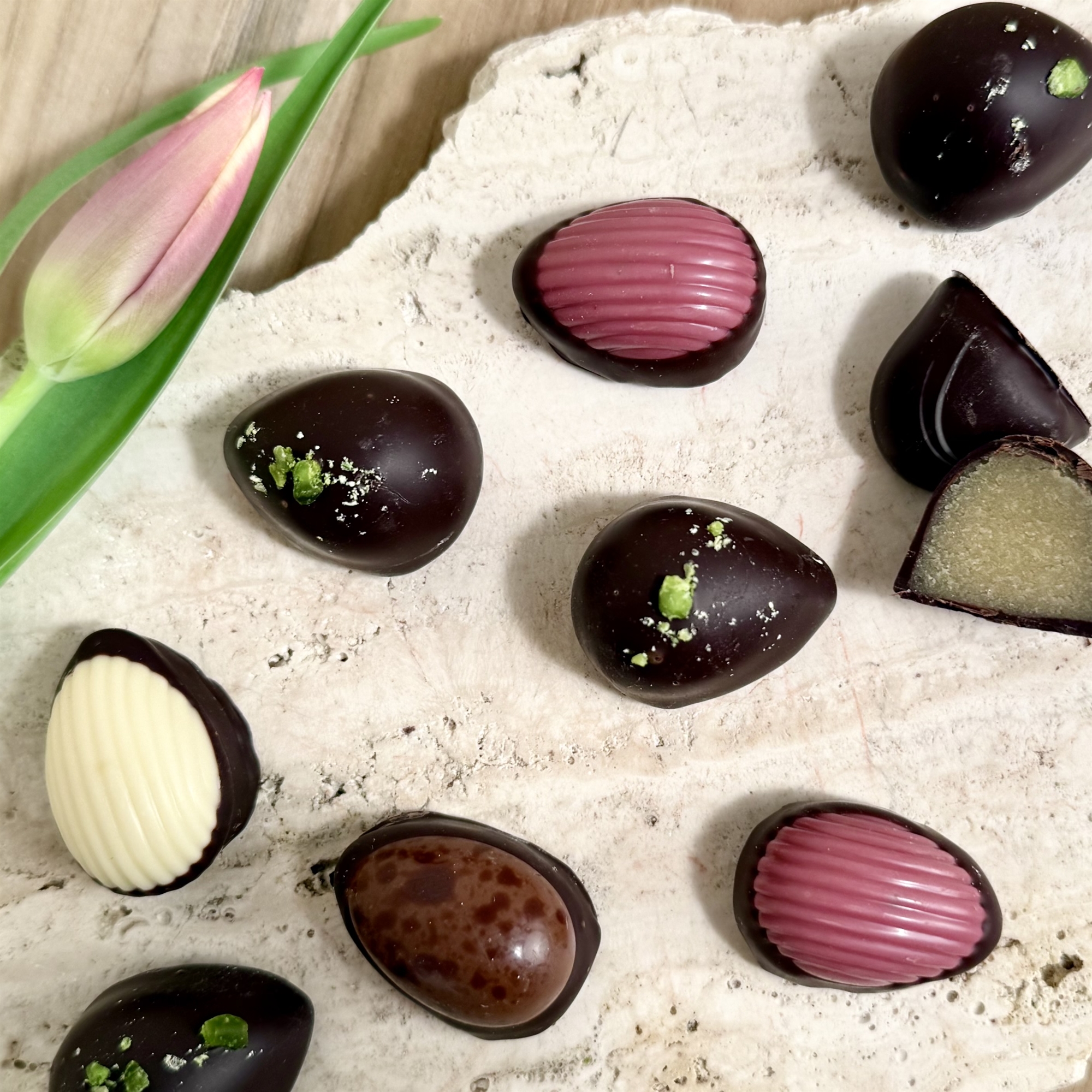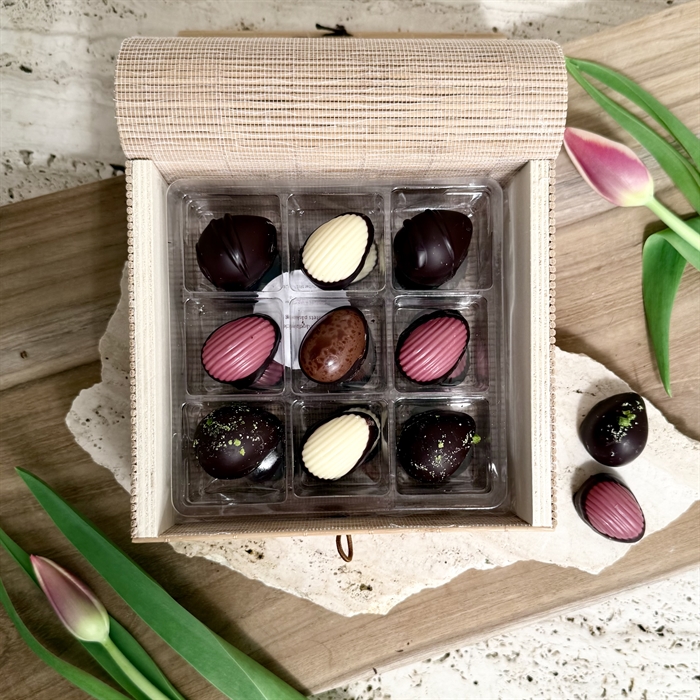 Flera Välsmakande Varianter. Dessa 9 utsökta påskägg levereras med ett urval av flera läckra smakvarianter. Njut av en harmonisk blandning av både klassiska och moderna, nya smakkombinationer, där varje variant erbjuder en unik upplevelse. Från fyllig mörk choklad till silkeslen ljus choklad och krämig vit choklad – askens innehåll är skapat för att tillfredsställa varje chokladälskare.