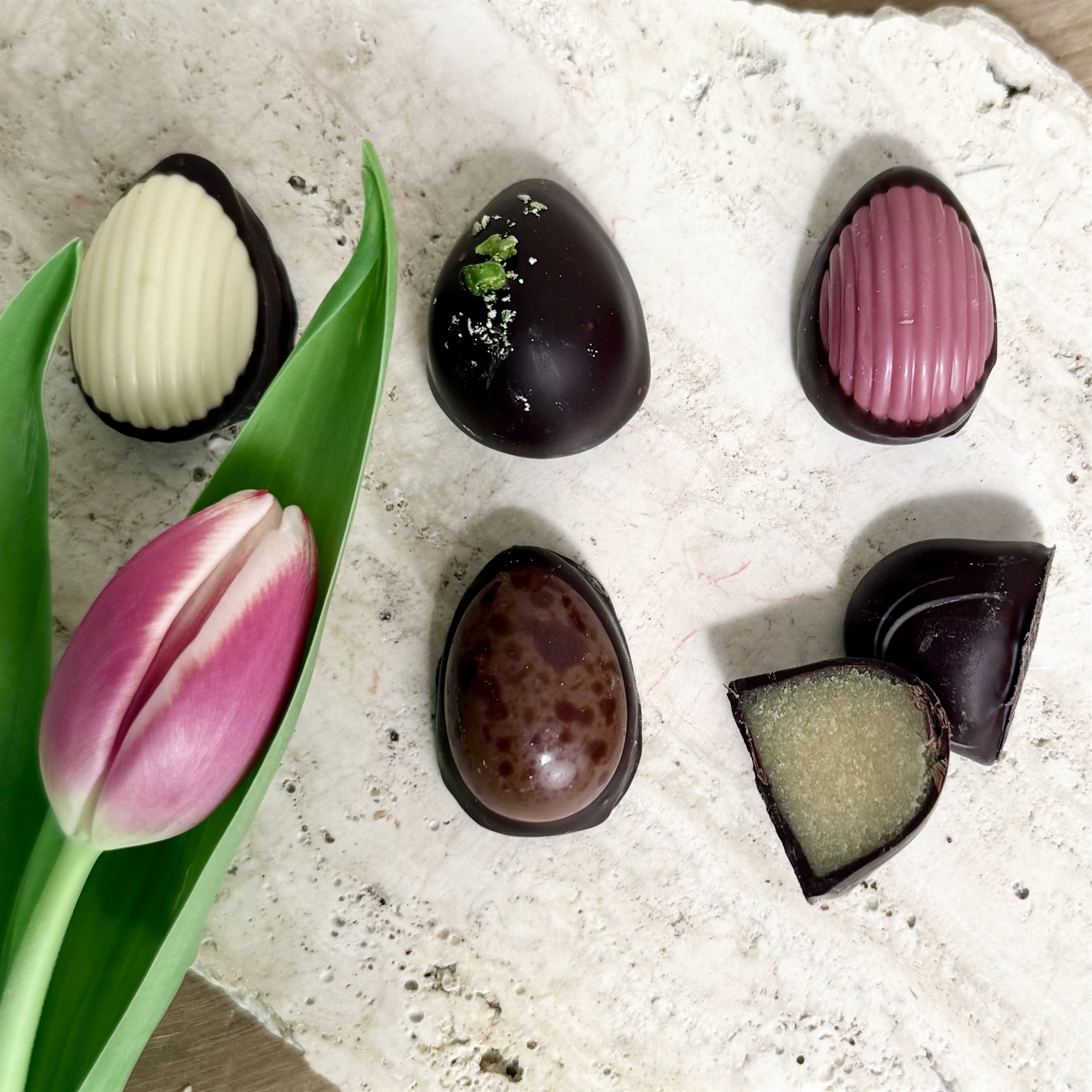 Handgjord Kvalitet med Fairtrade Choklad. Våra dessertpåskägg är skapade med stor omsorg och passion för chokladkonsten. De är tillverkade av noggrant utvalda kvalitetsråvaror och fairtrade-certifierad choklad, vilket säkerställer både en oöverträffad smakupplevelse och en ansvarsfull produktion. Med fokus på naturliga råvaror och hantverk får du här en ask som kombinerar smak, etik och elegans på bästa sätt till en sann känsla av lyx.