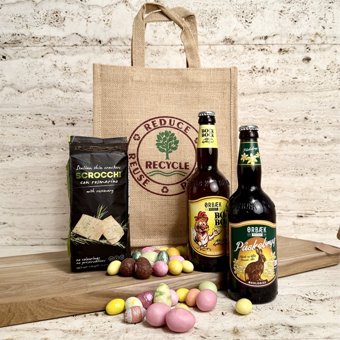Shoppingväska packad med 2 välsmakande danska ekologiska påskebrygder 50 cl, Italienska rosmarinkex och 200 g av vår Lyxig Påskeblanding