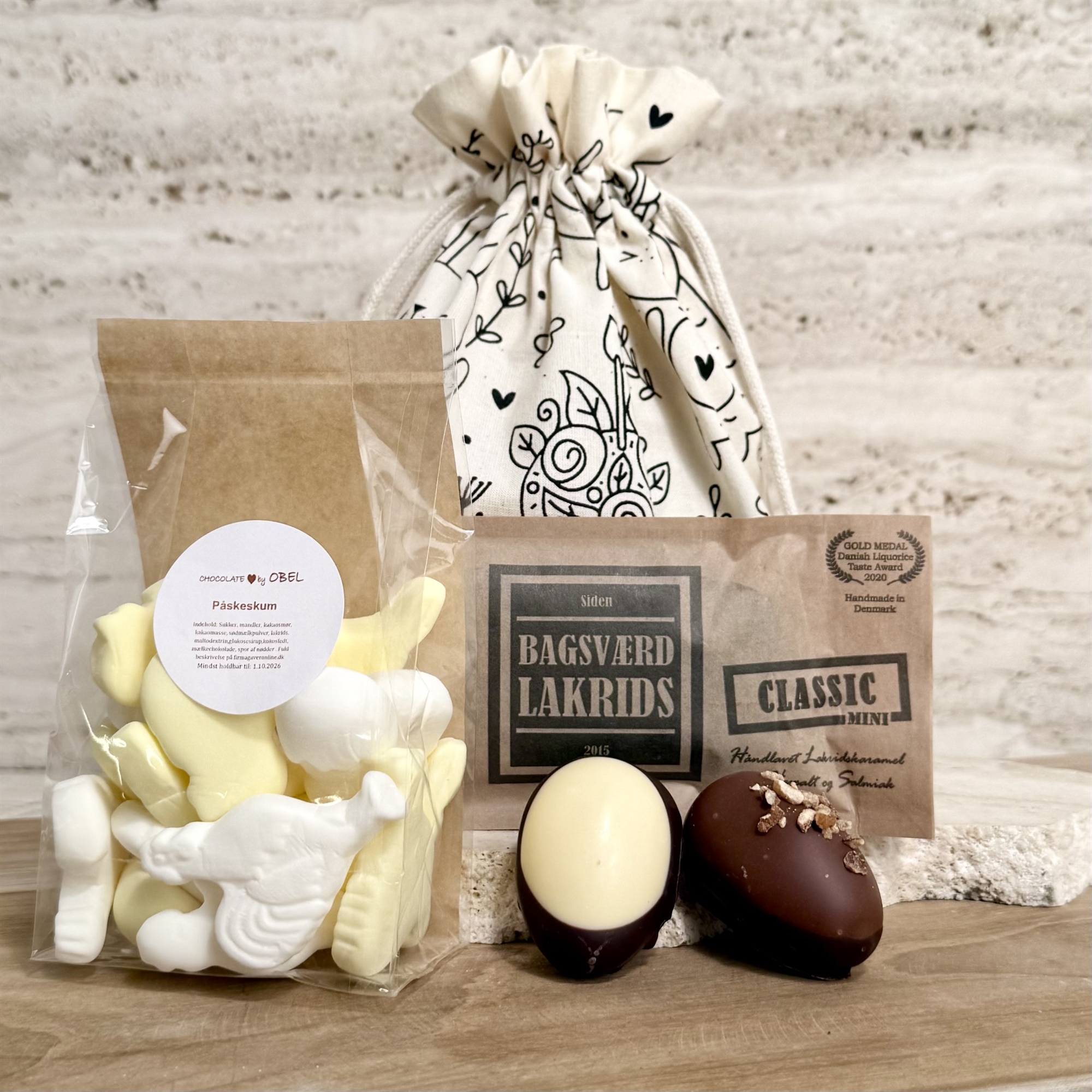 Ekologisk påse med påsktryck - Stora Danske påskägg, Anthon Berg och Bagsværd lakrits