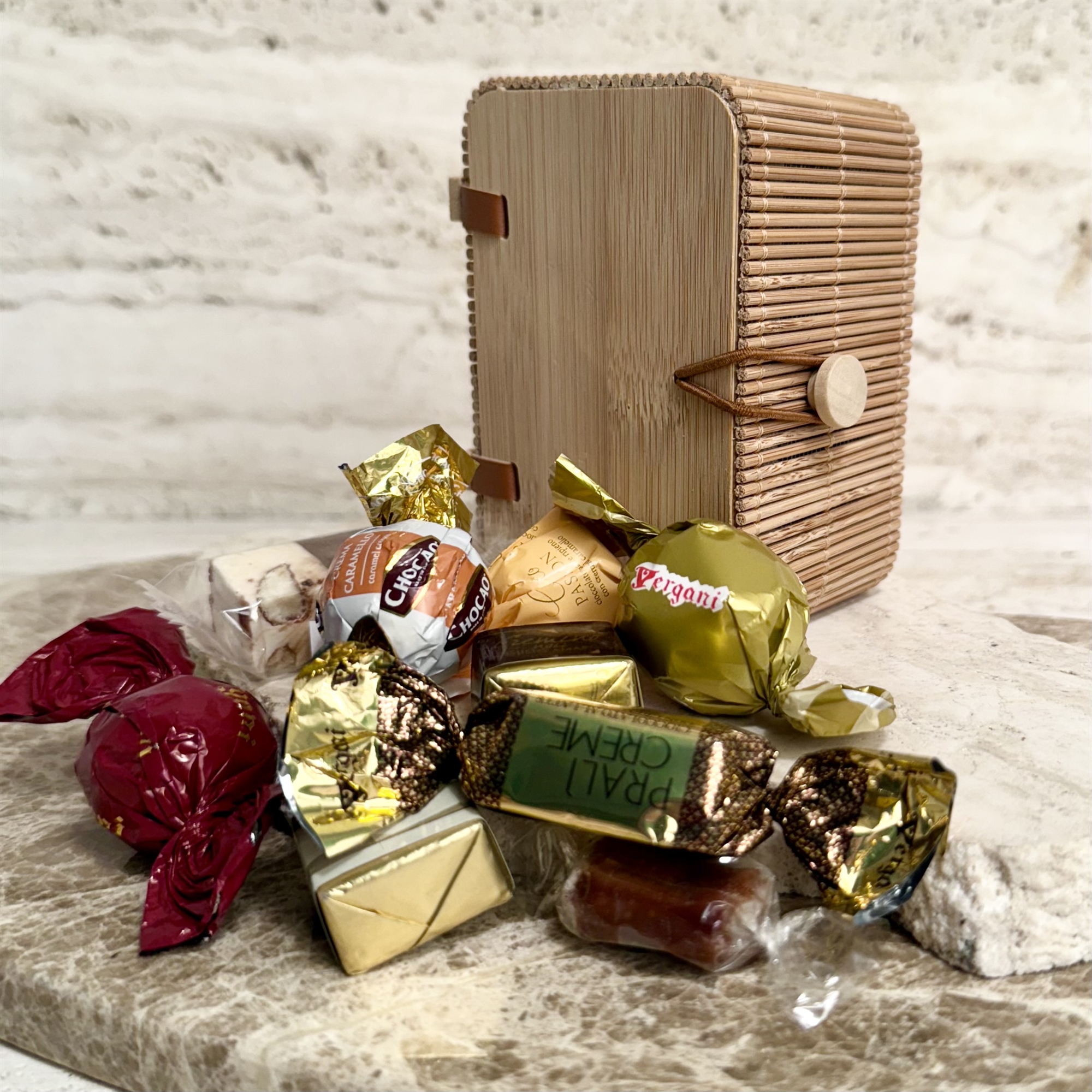 Innehållet i denna bambulåda består av en exklusiv blandning av kvalitetschoklader, som sträcker sig från välkända klassiker till utvalda smakkombinationer. Blandningen är noggrant sammansatt för att erbjuda en bred palett av smakupplevelser, som tillfredsställer varje chokladälskare. Det finns mellan 18 och 20 olika varianter. Ex.