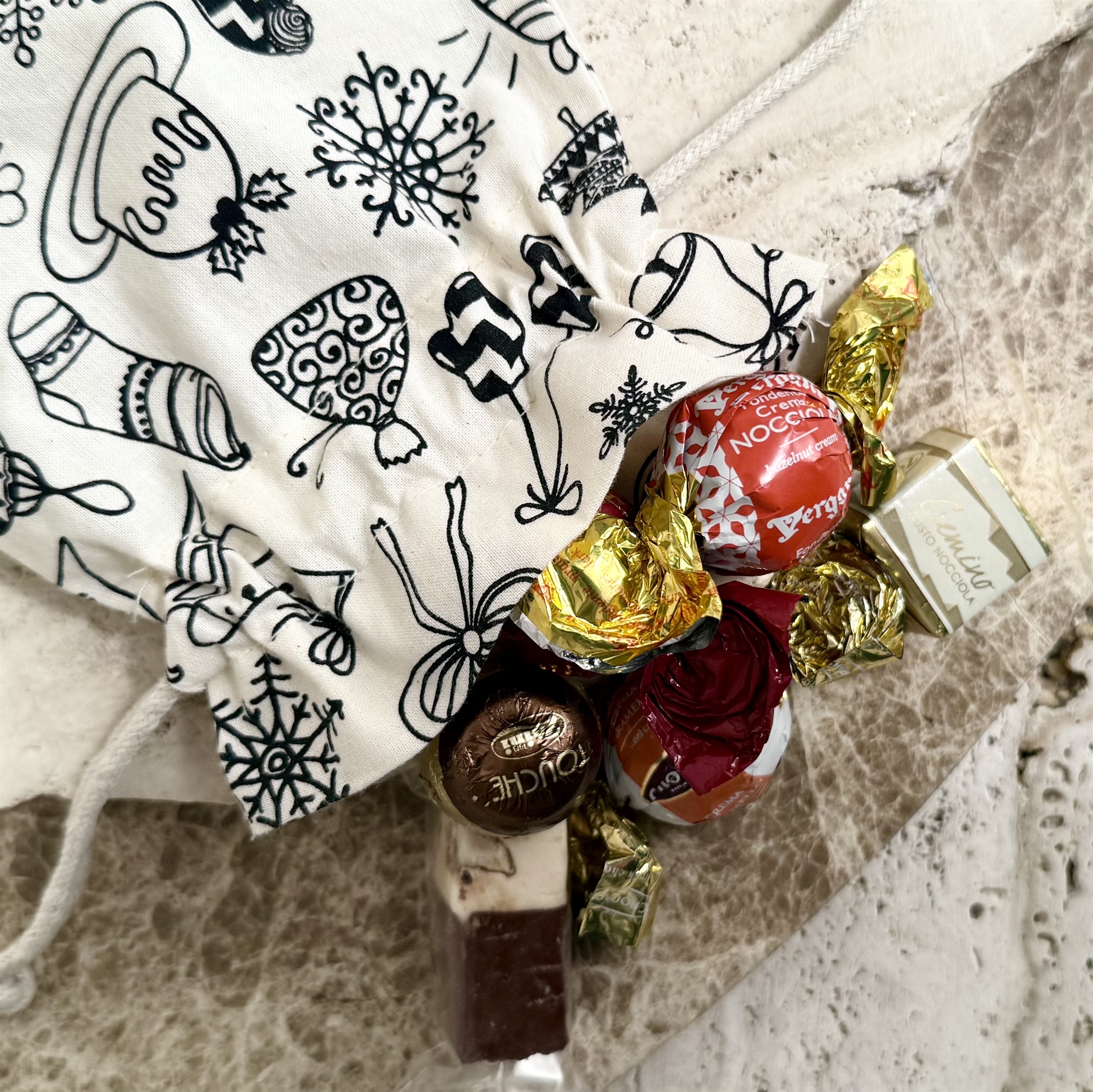 Bomullspåse med fina julmotiv i organic GOTS certifierad fylld med 200 gram av vår egen lyxiga chokladblandning. Fantastisk gåva där påsen kan återanvändas om och om igen och helt säkert håller mycket längre än den läckra chokladen som mixas av nedanstående varianter.