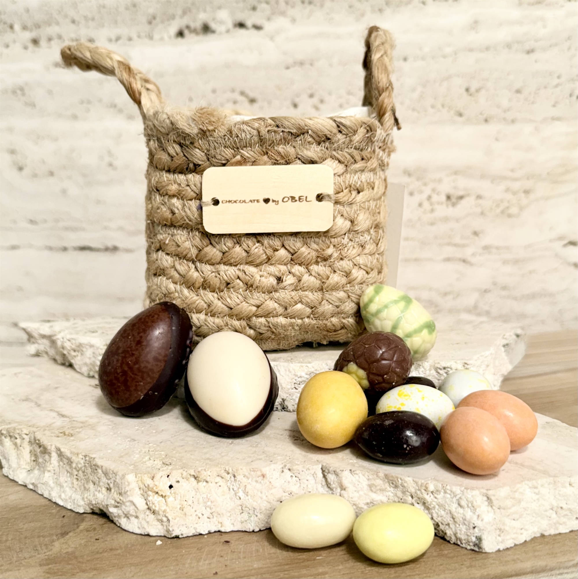 Ge en påskgåva som kombinerar läckra smakupplevelser med en grön och ansvarsfull signal. Denna vackra juteskål i 100 % nedbrytbart naturmaterial är i sig själv en gåva som kan återanvändas år efter år som dekorativ förvaring.