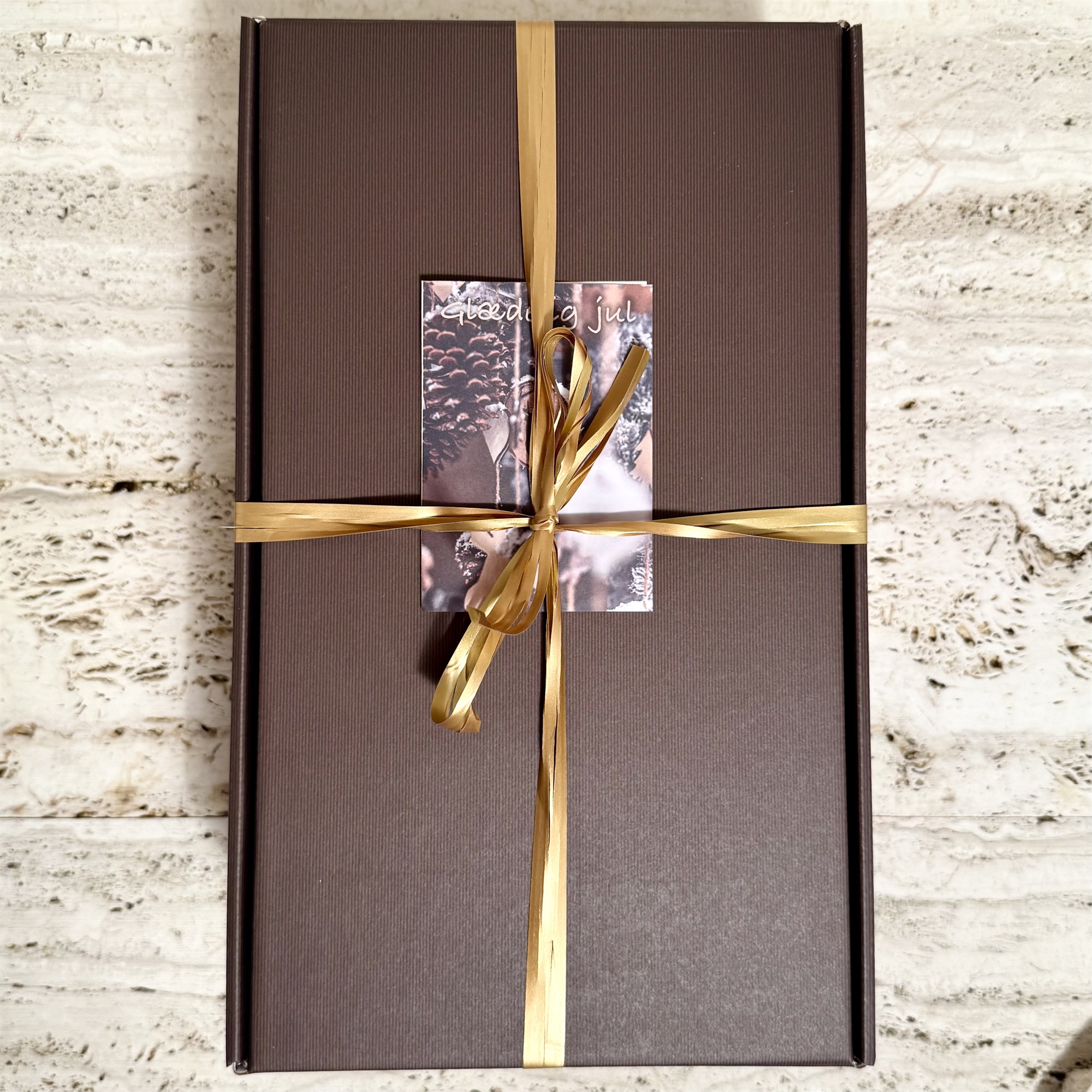 Allt är packat i en rustik brun presentask med miljövänligt nedbrytbart pappersband. Som alltid följer ett gratis kort med er text och företagslogotyp med, så att gåvan är helt redo att ges vidare.