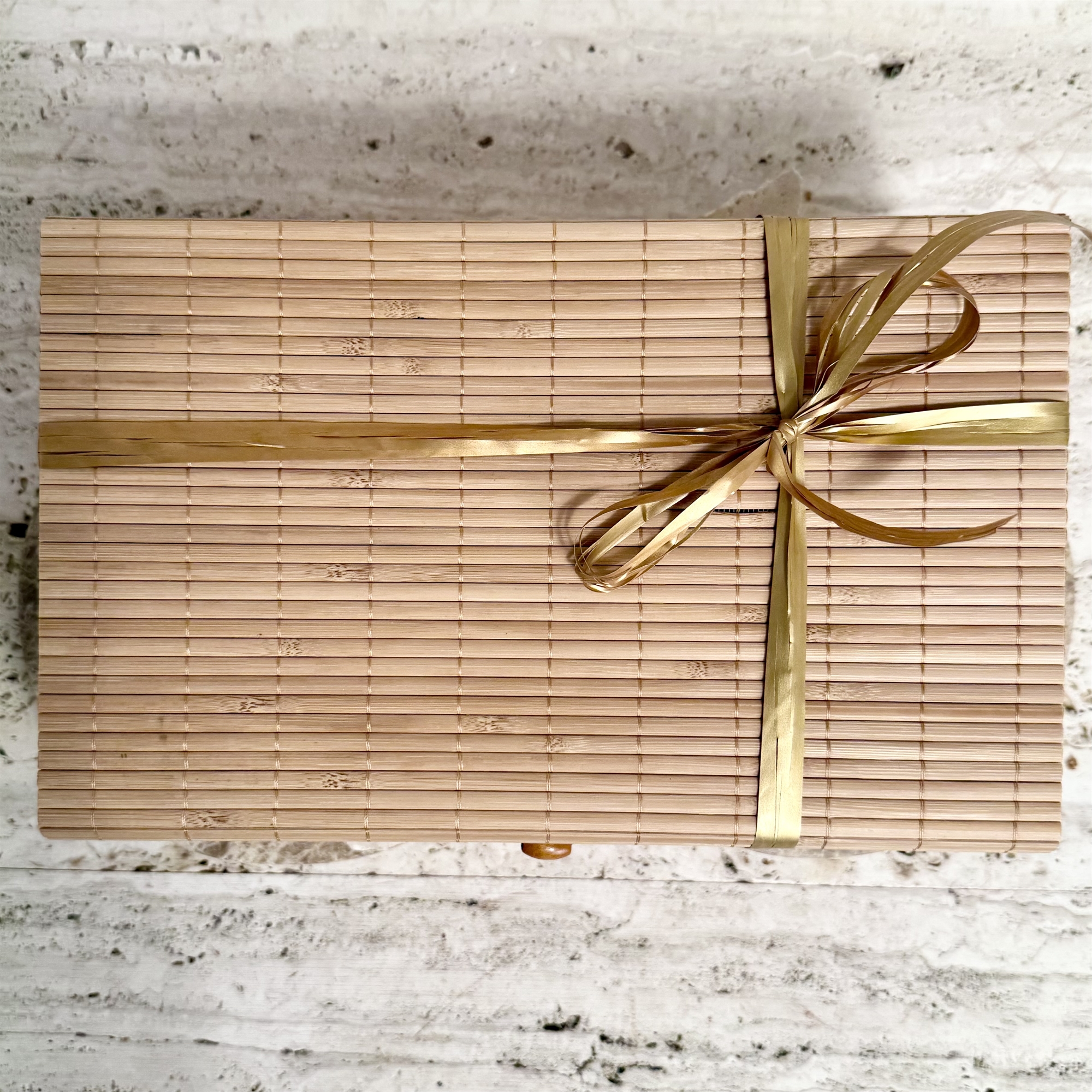 Gåvan är packad i vacker bambulåda med hållbart pappersband