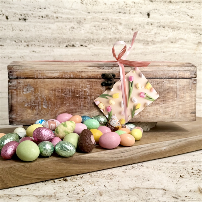 Ge en fin och välsmakande gåva till era medarbetare och samarbetspartners. Gåvan är packad med ett gratis kort med den text ni önskar inklusive företagslogotyp. Klar att ge vidare, så enklare blir det inte att ge en påskgåva, där innehållet helt säkert varar kortare tid än den fina handgjorda träkistan, som kan återanvändas många år framöver. Köp vår Lyxig Påskeblanding idag och upplev påskens mest utsökta choklad!