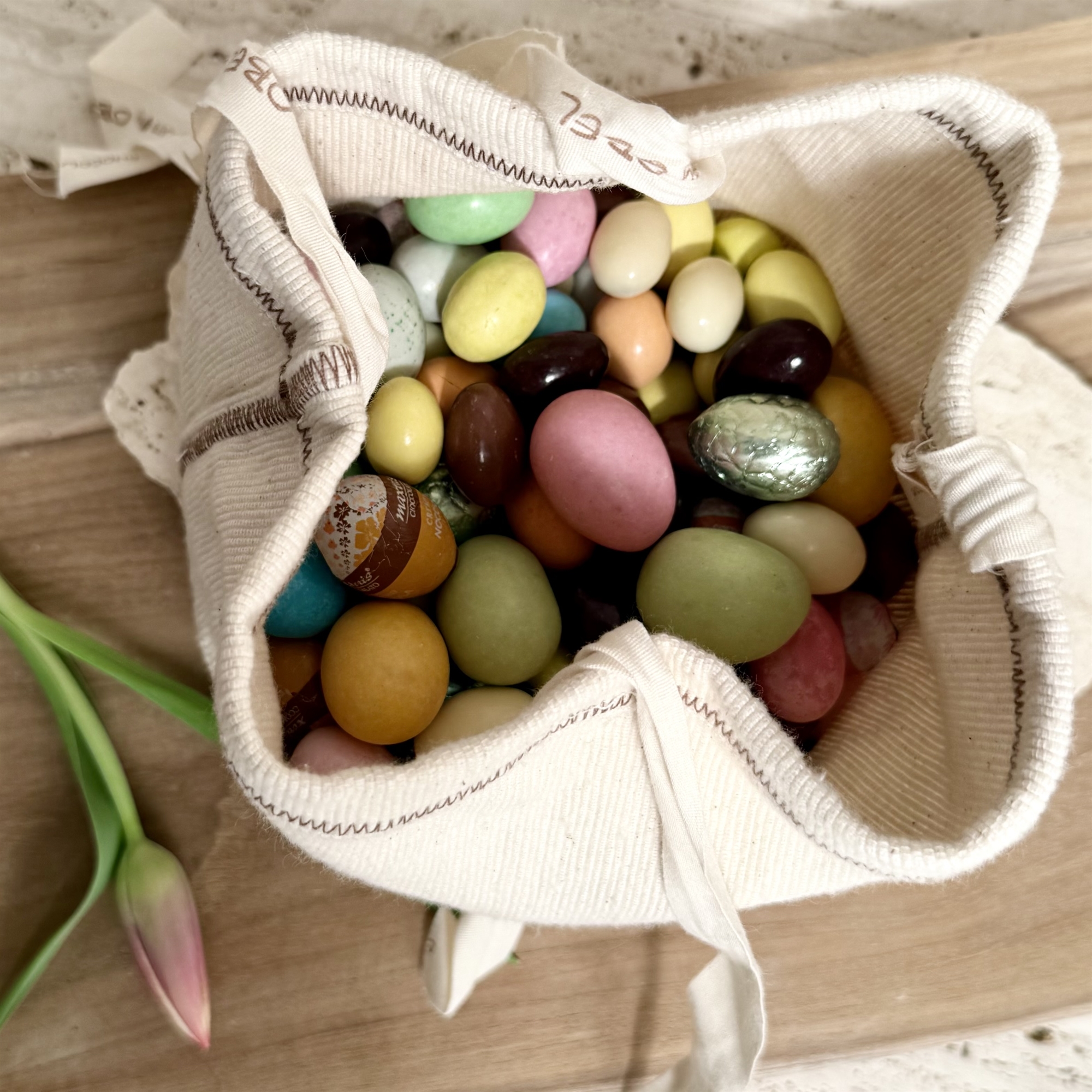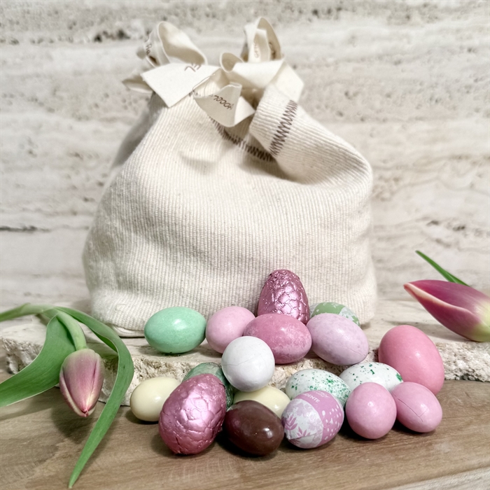 Rustik bomullspåse som är en fin gåva i sig själv. Fylld med 600 gram av vår Luksus Påskeblanding som är en av våra absolut bästa produkter, förfinad genom många år för att säkerställa en utsökt smakupplevelse. Blandningen innehåller ca.15 varianter av chokladpåskägg, noggrant utvalda från våra exklusiva leverantörer i Italien, Belgien och Danmark. Vi kompromissar aldrig med kvaliteten och varje enskilt påskägg är handplockat för sin unika smak och kvalitet.