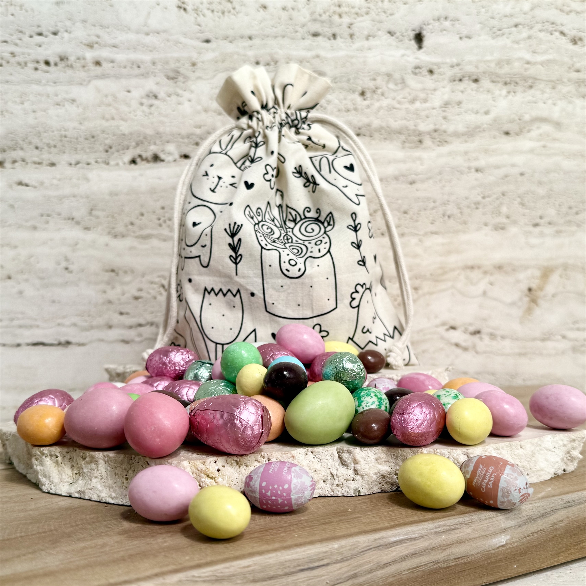 Ekologisk GOTS-certifierad bomullspåse med fint påsktryck fylld med 600 gram av vår Lyxig Påskblandning som är en av våra absolut bästa produkter, förfinad genom många år för att säkerställa en utsökt smakupplevelse. Blandningen innehåller ca.15 varianter av chokladpåskägg, noggrant utvalda från våra exklusiva leverantörer i Italien, Belgien och Danmark. Vi kompromissar aldrig med kvaliteten och varje enskilt påskägg är handplockat för sin unika smak och kvalitet.