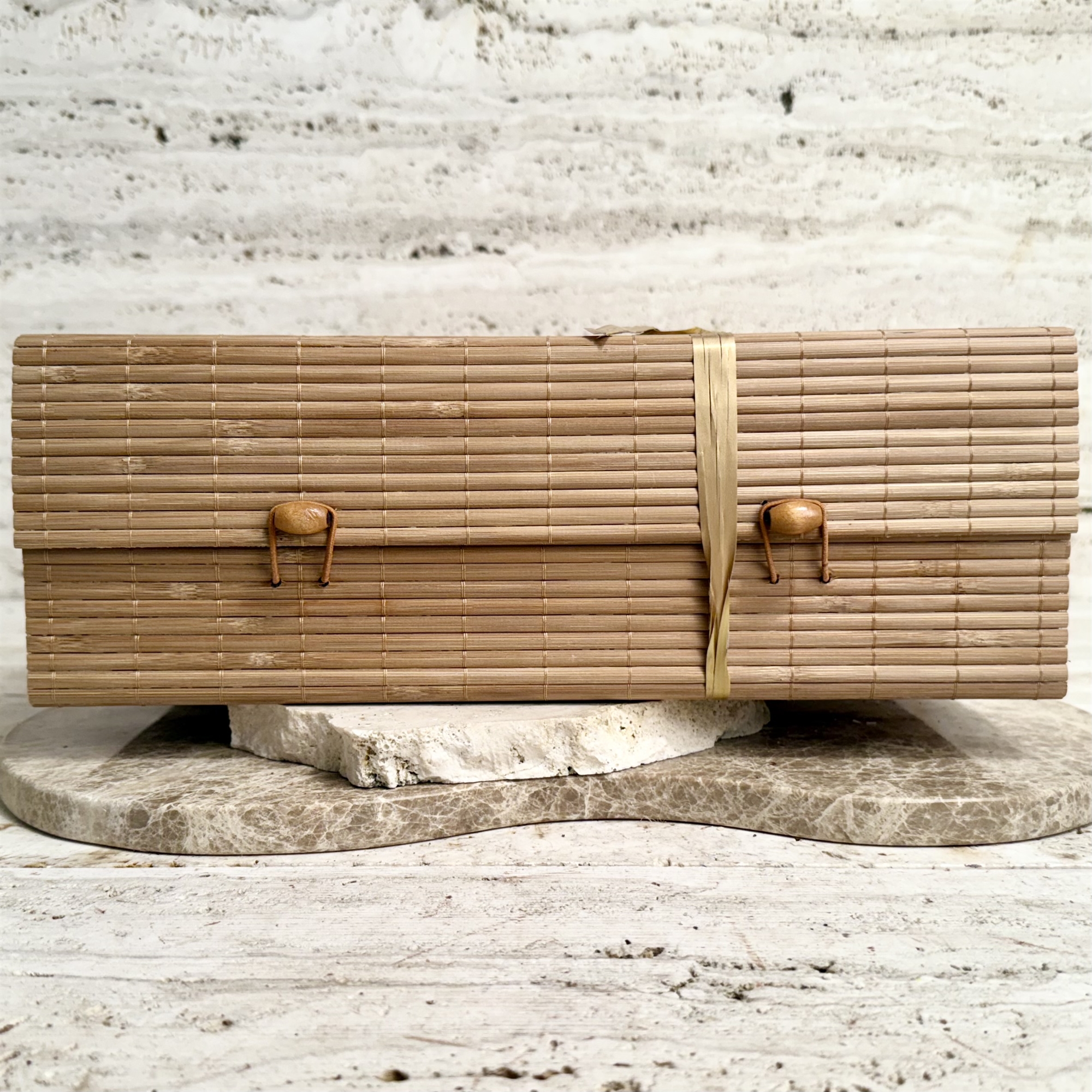 Gåvan är packad i vackert bambuskrin med hållbart pappersband